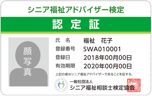 ございます。シニア福祉アドバイザー検定については、年に2回程度、東京・大阪などで会場を設定して紙ベースの検定試験を行う予定です。検定試験の予定は、シニア福祉アドバイザーのホームページ告知いたします。